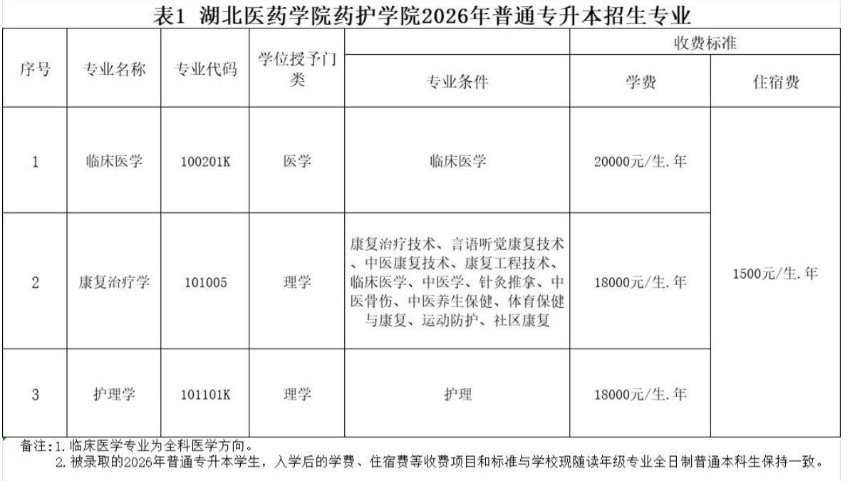 备注:1. 临床医学专业为全科医学方向;2. 被录取的2026年普通专升本学生,入学后的学费、住宿费等收费项目标准与学校同年级同专业全日制本科生保持一致。
