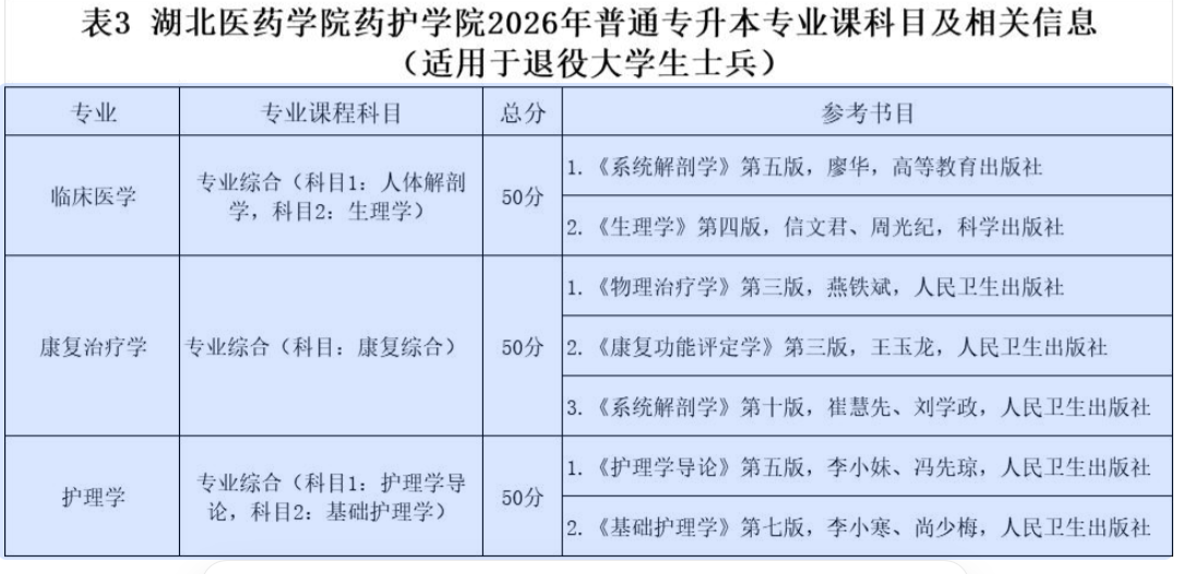 表3 湖北医药学院药护学院2026年普通专升本专业课科目及相关信息(适用于退役大学生士兵)