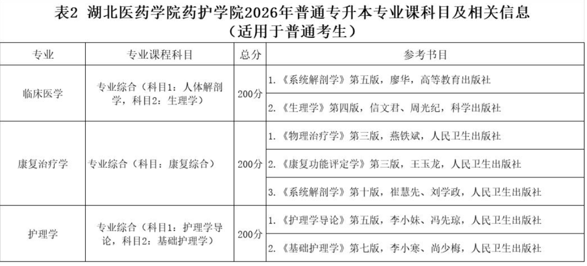 表2 湖北医药学院药护学院2026年普通专升本专业课科目及相关信息(适用于普通考生)