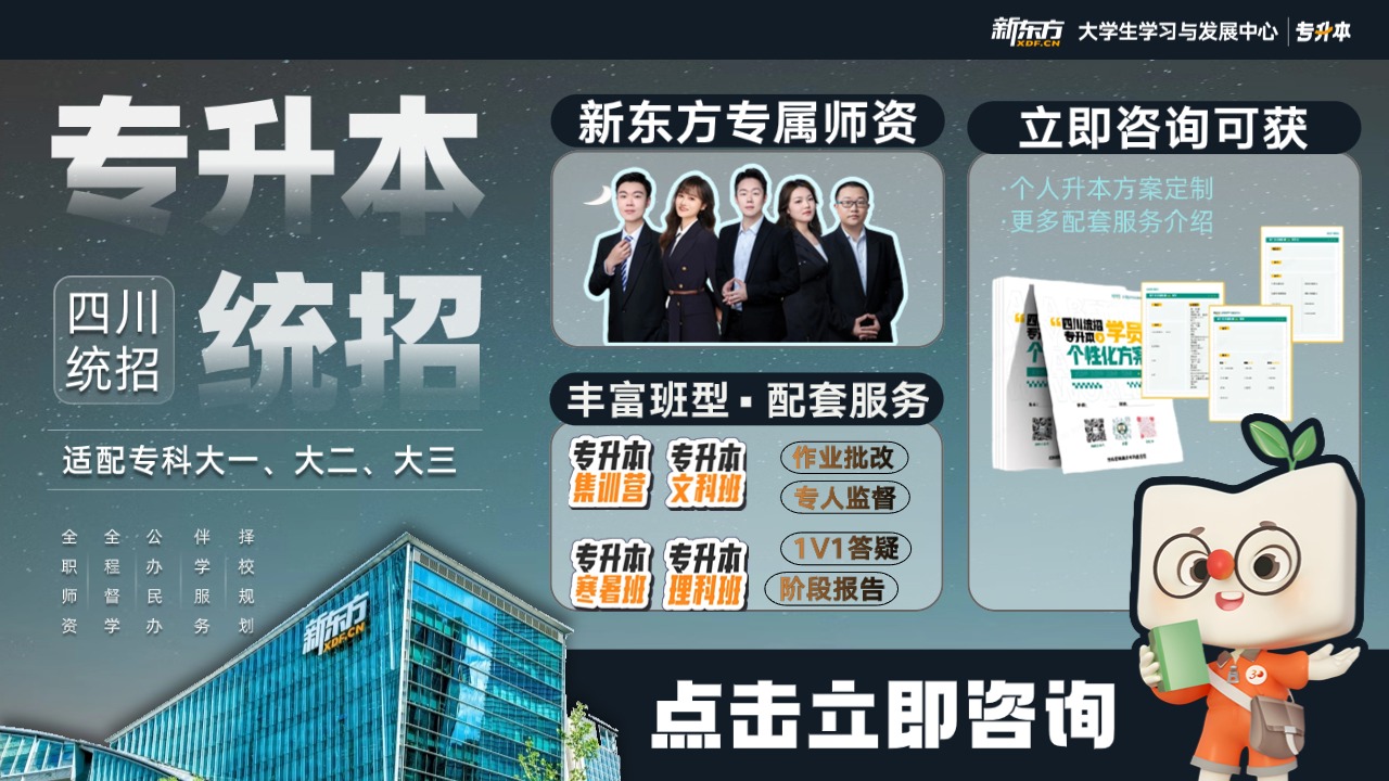 无论你是大二规划、大三冲刺,还是 0 基础、无规划的考生,成都新东方专升本都是靠谱之选!依托品牌口碑与硬核师资,搭配贴合四川考情的系统化课程,精准解决备考难点。不用费心搜集资料、纠结备考计划,这里全程为你护航!点击右下方弹窗咨询在线老师,领取个性化学习规划,解锁专属升本干货,助你高效上岸理想本科!四川新东方专升本(成都)客服微信:18613293072(加微信)