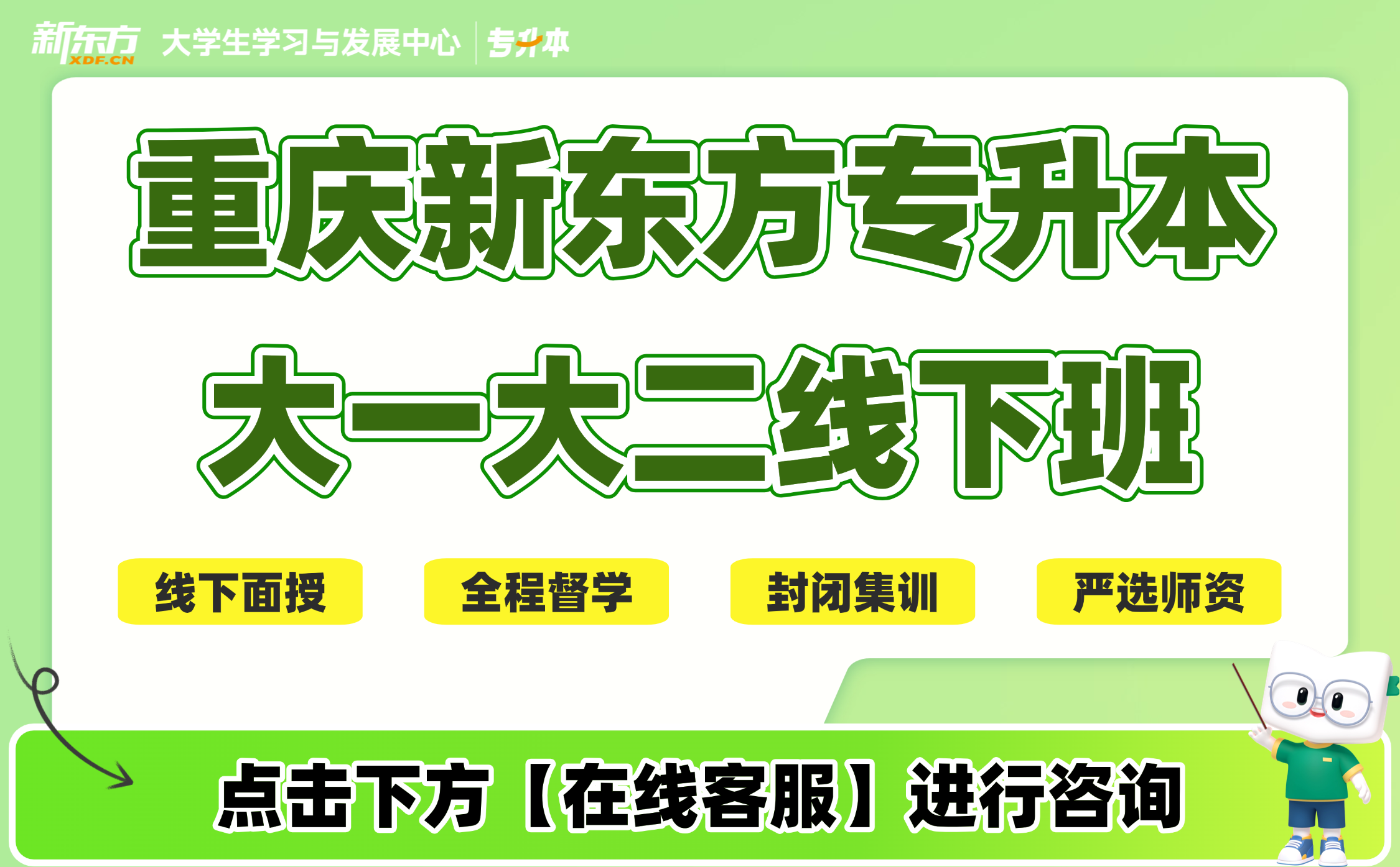 在专升本的关键赛道,专业助力让努力更有价值 —— 重庆新东方专升本凭借多年升学辅导经验,打造实力全职教师团队,从入门到冲刺循序渐进、稳步提升,主城各大校区均设有安静自习环境,助你远离干扰、高效备考。面向有意早准备、早规划的考生,我们提供多种班型选择,线上线下结合授课,拥有科学课程体系、浓厚学习氛围、全程教学支持。选择重庆新东方专升本,扎实前行、稳步上岸,可点击右下角在线客服咨询预约、免费试听,抢占升学先机!