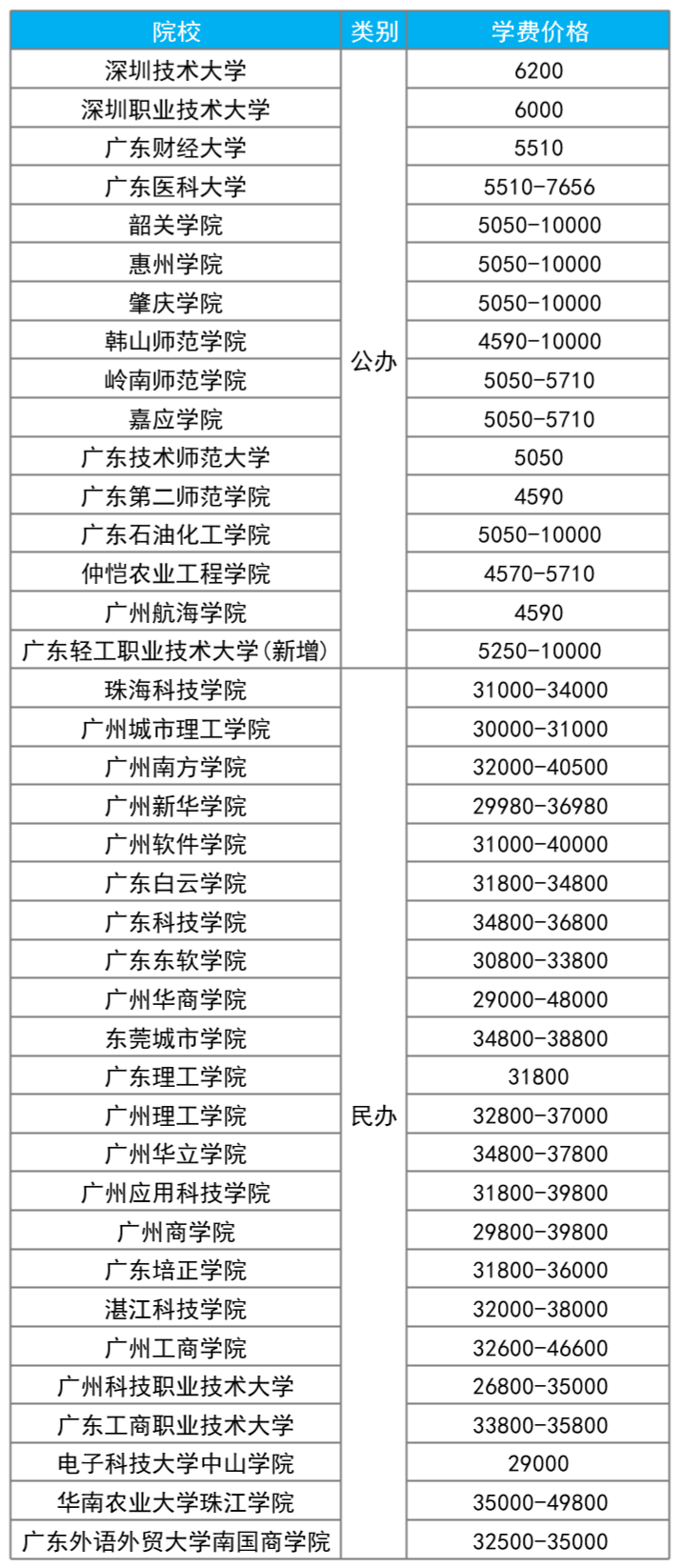 从表格中可以看出,公办院校的学费普遍较为亲民,大多数集中在4500元至10000元之间。其中: